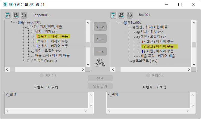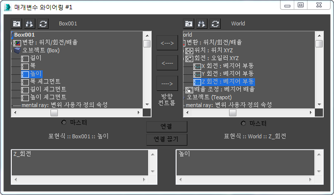 매개변수 사이에서 기존 와이어가 있는 매개변수를 선택하면 연결 끊기 버튼이 활성화됩니다. 그러면 와이어 제어기가 제거되고 드라이버 매개변수의 애니메이션 트랙(양방향인 경우)이나 기본 제어기(단방향인 경우)로 대체됩니다.