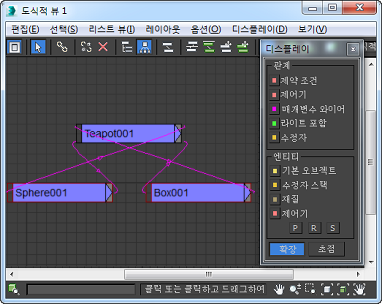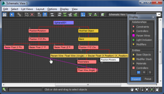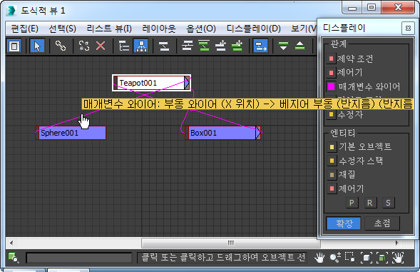 매개변수가 장면 노드에서 와이어링된 경우(예: 오브젝트에 적용된 수정자의 매개변수에 대한 오브젝트의 위치) 와이어링은 도식적 뷰에서 쉽게 나타나지 않을 수 있습니다. 그러나 추가 표시 옵션을 사용하여 와이어링을 노출할 수 있습니다.