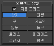 오브젝트를 만든 후에는 3ds Max에서 이 오브젝트를 임시 작업 그리드에 배치합니다. 오브젝트를 만들 때 커서가 다른 오브젝트 위에 없으면 3ds Max에서 해당 오브젝트를 현재 활성 그리드에 배치됩니다.