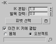 IK 오브젝트 선택Biped의 손이나 발이 따르도록 할 오브젝트를 선택하려면 클릭합니다. IK 혼합이 1이고 오브젝트가 선택되어 있으면 손이나 발이 오브젝트를 따릅니다.