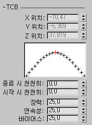 - 키에서 곡선의 접선 특성을 제어합니다. 기본 설정은 키를 통해 부드러운 애니메이션 곡선을 생성하는 유일한 값입니다. 다른 모든 값은 애니메이션 곡선에 불연속을 만들어 애니메이션이 갑자기 변경됩니다. 기본값은 25입니다.