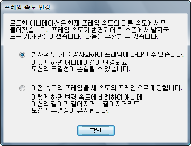Biped에 BIP 파일을 로드하고 BIP가 현재 장면과 프레임 속도가 다른 장면에서 저장된 경우 Biped에 이 대화상자가 열립니다.