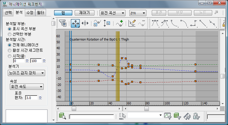 특히 가져온 모션 캡처 데이터를 작업하는 경우 표준 3ds Max 도구 세트를 사용하여 곡선을 편집하는 것이 어렵습니다. 이는 모든 프레임에 모션 캡처 데이터의 키가 있는 경우가 많아서 곡선 조작이 부담스럽고 불편하기 때문일 수 있습니다. 시각적으로 문제 부분을 파악하는 것이 어렵습니다. 애니메이션 워크벤치는 키를 줄이거나 모션 곡선에 필터를 제공하여 애니메이션을 부드럽게 하는 자동 기능을 제공합니다.
