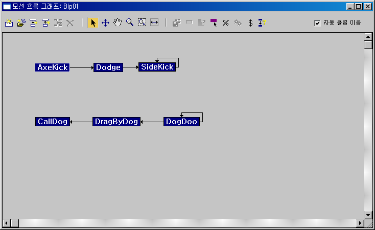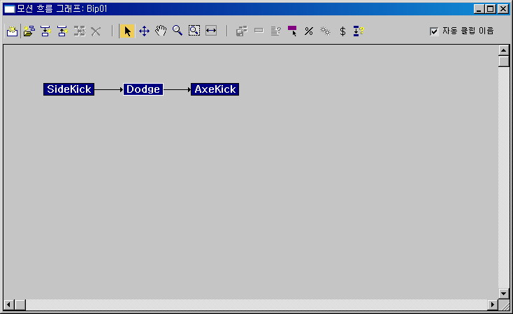 군중 시뮬레이션은 수십 개의 모션 클립을 사용하여 최적 전환을 자동으로 만들 때 많은 시간을 절약할 수 있습니다. 모션 흐름 모드를 사용하여 하나 또는 많은 Biped의 애니메이션을 계획하든 관계없이 모션 흐름 그래프의 클립 간에 전환이 필요합니다.