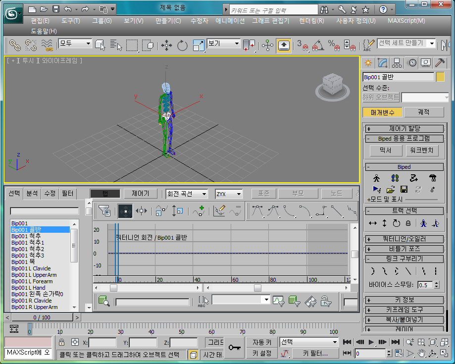 워크벤치 도구 모음에서 제어기 버튼을 클릭하여 포함된 곡선 편집기의 제어기 창을 표시합니다. 리스트에 표시된 Biped 몸체 트랙은 해당 몸체 부분에 연결된 또는 해당 몸체 부분의 IK 오브젝트로 사용되는 모든 장면 오브젝트와 함께 선택 패널에서 선택된 트랙입니다. 제어기 리스트는 곡선 편집기의 제어기 리스트와 유사합니다.