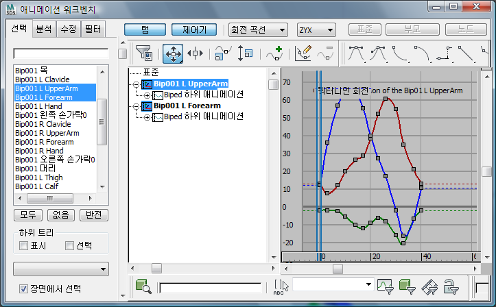 표준 3ds Max 트랙 뷰 탐색 도구를 사용하여 곡선 뷰 창에서 곡선 뷰를 조정합니다. 일반적으로 확대/축소, 수평 및 수직 범위 확대/축소 및 Pan을 사용하여 전체 곡선 또는 곡선의 일부에 대한 보다 나은 뷰를 얻게 됩니다. 곡선 뷰는 기본적으로 뷰포트에서 선택된 모든 Biped 오브젝트의 곡선을 자동으로 표시합니다.