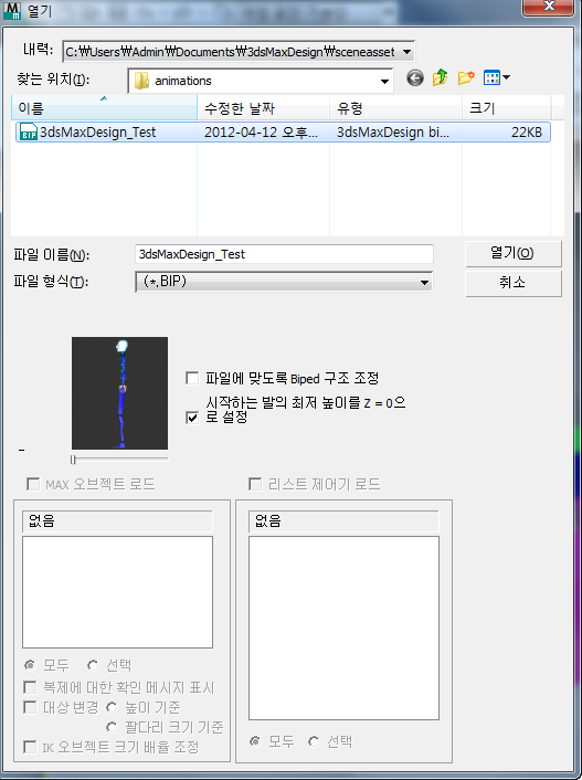 이전 버전의 character studio로 저장된 BIP 파일을 선택하는 경우 미리 보기를 표시할 수 없습니다. 로드할 파일을 선택하면 더이상 이 메시지를 표시하지 않도록 선택하지 않은 경우 파일이 구형이며 다시 저장되어야 한다는 메시지가 표시됩니다.