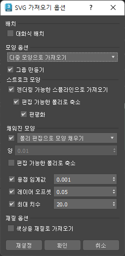 - 선택하면, 모양이 레이어 순서에 따라 지정된 양만큼 로컬 Z 위치에서 간격띄우기가 설정됩니다. 선택하면 가장 큰 치수가 지정된 값과 일치하도록 SVG 파일의 배율이 조정됩니다. SVG 파일은 인코딩된 배율에 따라 매우 달라질 수 있으므로 유용할 수 있습니다. SVG 파일의 정확한 배율 왕복 내보내기 및 가져오기를 위해 이 옵션을 비활성화해야 할 수 있습니다.