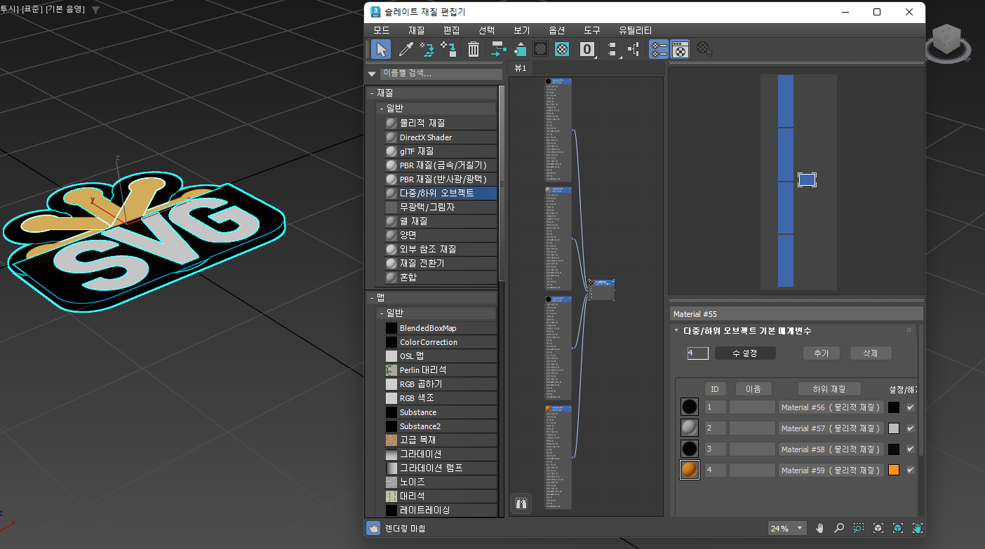 W3C SVG 로고를 가져와서 슬레이트 재질 편집기의 옵션과 함께 표시
