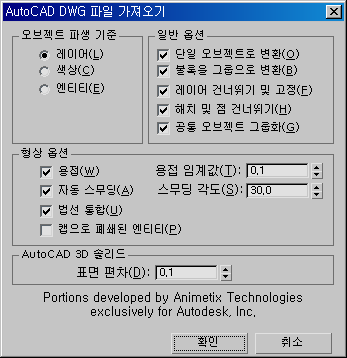 법선 통합이 꺼져 있으면 법선은 도면 파일의 면 정점 순서에 따라 계산됩니다. 3D 솔리드의 면 법선은 이미 통합되어 있습니다. 3D 솔리드 모델을 가져올 때는 법선 통합을 끕니다.