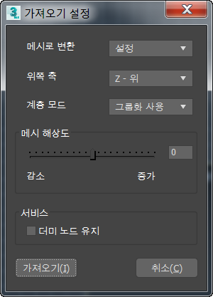 - 설정하면 가져온 파일의 더미 오브젝트가 3ds Max 더미 오브젝트가 됩니다. 기본적으로 해제되어 있습니다.