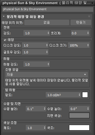 - 하늘의 밝기를 설정합니다. 값 1은 실제 하늘을 시뮬레이션합니다.