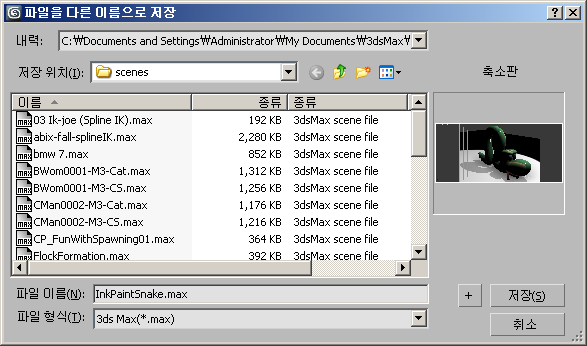 예를 들어 파일 이름 test00.max을 선택하였고 + 버튼을 클릭하면 이름을 test01.max로 변경하며 이를 test01.max를 저장합니다.