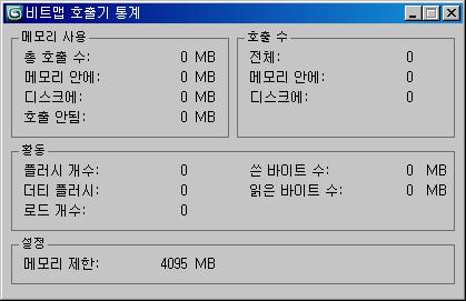 비트맵 호출기 통계 대화상자에서는 텍스처 맵에 많은 메모리가 필요한 장면과 관련된 문제 해결에 유용한 정보를 제공합니다. 이 대화상자는 고급 사용자가 장면을 디버그하고 렌더 시간을 줄이는 데 사용됩니다.