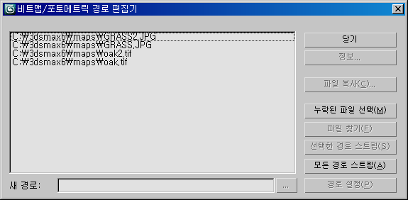리스트에서 파일을 선택하지 않은 경우 대화상자에서 사용 가능한 컨트롤은 닫기, 누락된 맵 선택 및 모든 경로 스트립뿐입니다.