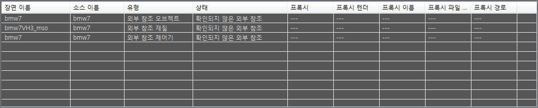 현재 외부 참조 레코드 리스트에서 강조 표시된 레코드에 속한 외부 참조 오브젝트, 제어기 및 재질을 표시합니다. 강조 표시된 소스 파일이 없으면 이 리스트가 비어 있습니다.