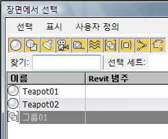 그룹 이름은 그룹 오브젝트에서 수행한다는 점을 제외하고 오브젝트 이름과 유사합니다. 선택 플로터에 있는 것과 같은 리스트에서 그룹 이름은 각괄호로 표시됩니다. 예를 들면 [Group01]입니다. 장면 탐색기 및 관련 대화상자에서는 대신에 그룹 오브젝트 아이콘이 각괄호 안에 표시됩니다.
