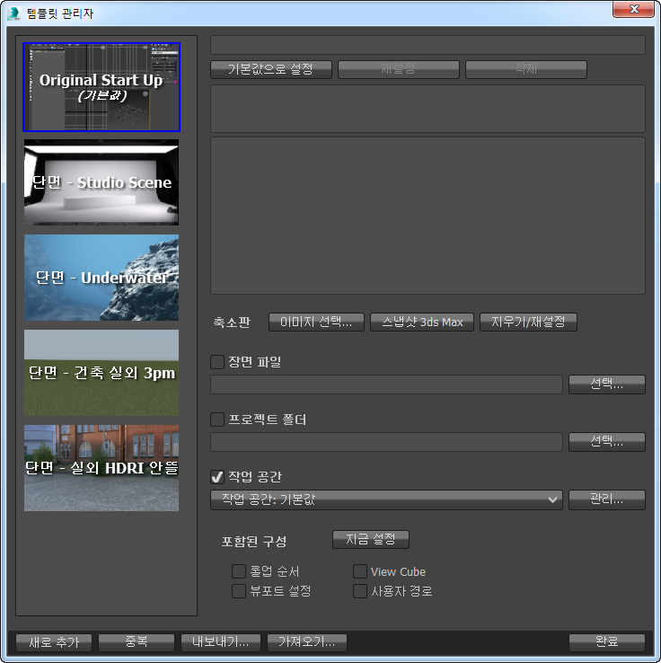 - 활성 템플릿을 이후의 3ds Max 세션의 기본값으로 설정합니다.