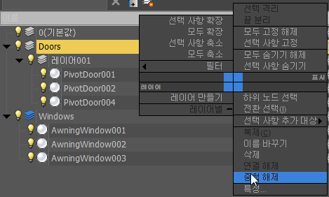레이어 탐색기는 다음 명령 중 하나를 사용할 때 열리는 장면 탐색기 버전입니다. 이 모드에서는 오브젝트, 레이어 및 레이어 계층을 볼 수 있지만 오브젝트 계층 또는 그룹은 볼 수 없습니다. 레이어 탐색기는 레이어를 만들고 중첩하며 레이어 간에 오브젝트를 이동하는 데 사용됩니다.