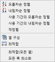 주: 열 제목 오른쪽의 빈 영역을 마우스 오른쪽 버튼으로 클릭하면 메뉴에 열 구성 및 최적합(모든 열) 명령만 들어 있습니다.
