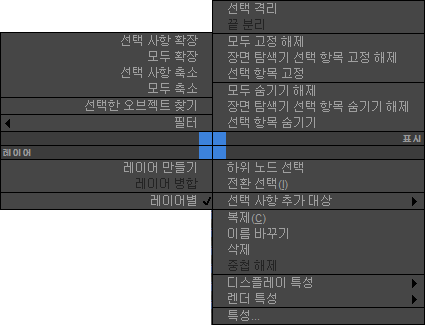 장면 탐색기의 열 안을 마우스 오른쪽 버튼으로 클릭하면 다음 쿼드 메뉴가 열립니다.