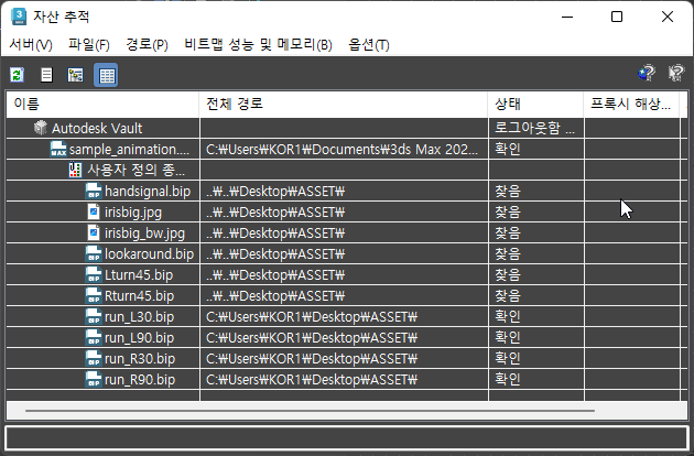 자산 추적 대화상자 창은 현재 설정에 따라 트리 혹은 테이블 뷰에서 현재 장면의 모든 자산의 리스트를 보여줍니다. 나열된 자산에는 장면 파일, 소재 등에서 장면에 사용되는 이미지, 외부 참조, 포토메트릭 파일이 포함됩니다. 기본적으로 렌더링된 이미지 같은 출력 파일도 창의 리스트에 나타납니다. 원할 경우 이 파일의 표시를 끌 수 있습니다.