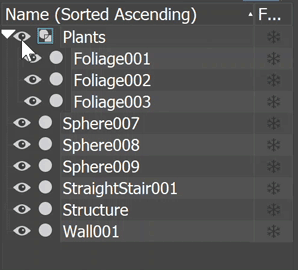 주: 장면 탐색기에서는 클릭할 때 해당 가시성을 토글할 수 있는 편리한 눈 모양 아이콘을 각 항목의 왼쪽에 제공합니다. 가시성 특성과 동일한 기능을 수행합니다.