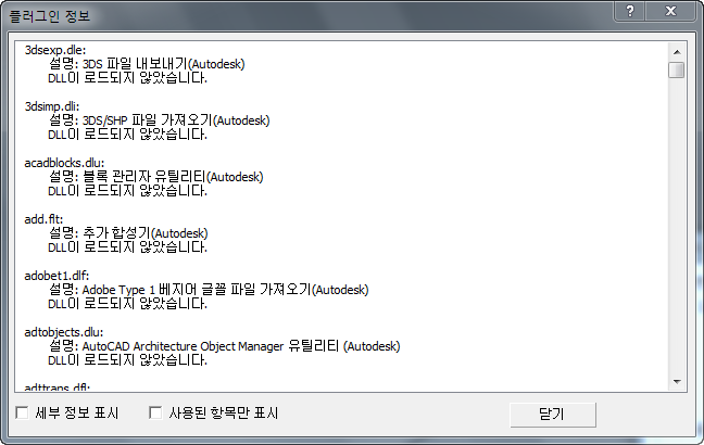 장면에 사용된 플러그인에 대한 정보가 포함된 하위 대화상자를 표시합니다. 기본적으로 하위 대화상자에는 각 플러그인의 이름과 간단한 설명이 표시됩니다.
