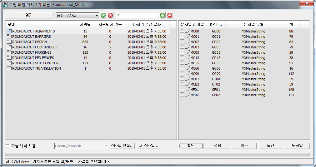 문자열을 현재 장면으로 이미 가져왔습니다. Civil View는 이전에 가져온 문자열에 대해 모든 문자열 및 모델 이름을 자동으로 확인합니다. 동일한 문자열 레이블과 모델 이름 조합이 현재 장면에 이미 있을 경우 해당 리스트 항목을 사용하지 않습니다.