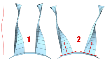 면 법선에 정렬을 사용하면 돌출은 스플라인 (1)의 원래 방향과 같지 않고 면 법선 (2)에 맞도록 방향이 다시 지정되거나 인접한 선택 항목을 따라 평균 법선이 됩니다. 회전 옵션은 면 법선에 정렬이 선택되어 있는 경우에만 사용할 수 있습니다.