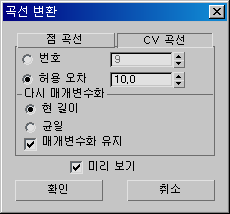 - 점 곡선 또는 CV 곡선으로 변환할지 선택합니다. 곡선이 이미 선택한 유형인 경우 이 대화상자의 설정은 곡선을 변환하지 않지만 해당 특성을 변경합니다. 기본값은 CV 곡선입니다.