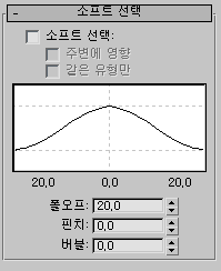 점 및 CV 하위 오브젝트의 소프트 선택 롤아웃에는 이 기능에 대한 컨트롤이 있습니다. 소프트 선택 확인란은 기본적으로 해제되어 있습니다.