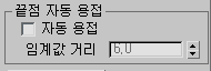 - 자동 용접을 설정하면 같은 스플라인의 다른 끝점의 임계 거리 내에서 고정 또는 이동하는 끝점 정점이 자동으로 용접됩니다. 이 기능은 오브젝트 및 모든 하위 오브젝트 수준에서 사용할 수 있습니다.