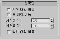 선직면 구성에 사용된 곡선 방향 중 하나를 대칭 이동합니다. 상위 곡선의 방향을 이용하여 선직면이 만들어집니다. 두 상위가 반대 방향일 경우 선직면은 나비 넥타이 모양이 될 수 있습니다. 상태를 바로 잡으려면 해당 상위 곡선의 반대 방향을 이용하여 선직면을 구성하도록 시작 대칭 이동 또는 끝 대칭 이동을 사용합니다. 이 컨트롤은 곡선을 역전시킬 필요를 없애줍니다.