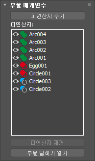 - 합성 모양을 만드는 데 관련된 피연산자를 표시합니다. 피연산자 매개변수 롤아웃에 표시된 대로, 색상 아이콘은 현재 수행한 부울 연산을 나타냅니다. 눈 모양 아이콘을 클릭하여 각 피연산자의 가시성을 켜거나 끌 수 있습니다.