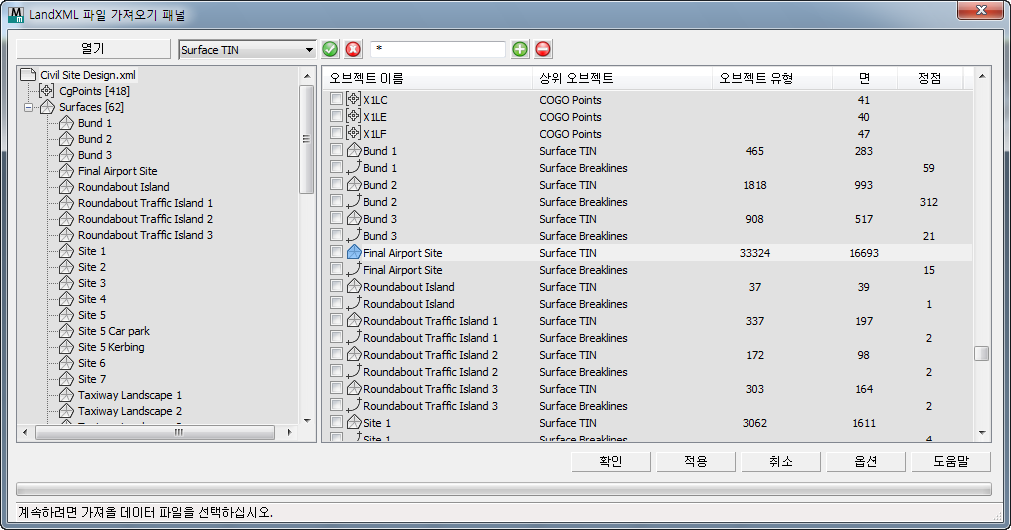 다른 모든 LandXML 오브젝트 유형은 무시됩니다.