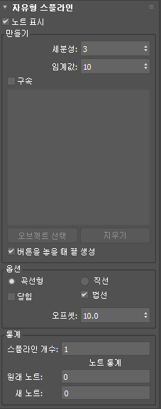 - 활성화된 경우 마우스 버튼을 놓으면 자유형 스플라인을 생성합니다. 비활성화된 경우 마우스 버튼을 다시 누르면 모양이 계속되어 스플라인의 열린 끝을 자동으로 연결합니다. 그리기를 마치려면 뷰포트에서 Esc 키 또는 마우스 오른쪽 버튼을 클릭해야 합니다.