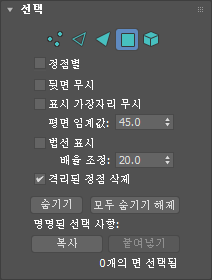 선택 롤아웃에서는 명명된 선택 사항 및 법선, 디스플레이 설정으로 작동하는 여러 하위 오브젝트 수준에 액세스하기 위한 도구를 제공하고 선택한 엔티티에 대한 정보를 표시합니다.