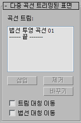 다중 곡선 트리밍 하위 오브젝트를 선택하면 다중 곡선 트리밍 매개변수가 있는 롤아웃이 나타납니다. 이 롤아웃은 하나의 다중 곡선 트리밍 하위 오브젝트를 선택할 때만 나타납니다. 한 번에 둘 이상의 여러 곡선 트리밍 오브젝트를 편집할 수 없으므로 다른 NURBS 하위 오브젝트와 달리 여러 곡선 트리밍 하위 오브젝트를 여러 개 선택하면 롤아웃이 나타나지 않습니다.