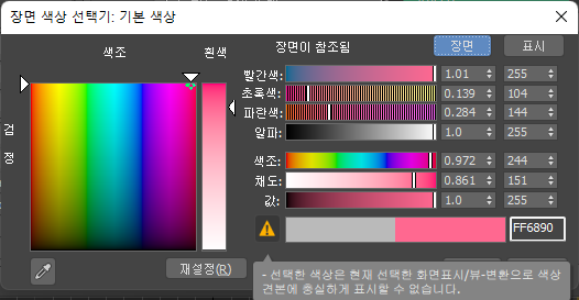 OCIO 기반 색상 관리를 사용하고 장면 공간에서 색상을 설정하면 슬라이더는 검은색 줄무늬를 사용하여 화면표시에 재현할 수 없는 색상을 나타냅니다. 여전히 이러한 색상을 선택할 수 있으며 화면표시에 가능한 가장 가까운 화면 색상이 표시됩니다. 또한 경고 기호가 나타납니다. 아이콘 위에 포인터를 놓으면 색상이 화면표시 범위 밖에 있는지, 렌더링 범위 밖에 있는지 또는 둘 다 밖에 있는지 확인할 수 있습니다.