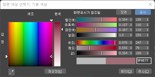 값 슬라이더 아래의 한 쌍의 색상 견본을 사용하여 표시 공간에서 오른쪽에 표시된 새 색상을 왼쪽에 표시된 원래 색상과 비교할 수 있습니다.