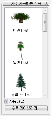 팔레트는 현재 수목 라이브러리에서 로드된 식물을 표시합니다. 장면에 식물을 추가하는 세 가지 방법이 있습니다.