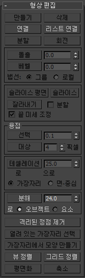 메시의 형상 편집 롤아웃은 오브젝트(최상위) 수준이나 하위 오브젝트 수준 중 하나에서 메시의 형상을 변경할 수 있게 하는 대부분의 컨트롤을 포함합니다.