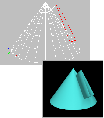모따기는 선택한 하위 오브젝트를 "잘라 내어" 원래 하위 오브젝트로 이어지는 모든 보이는 가장자리에서 새 점을 연결하는 새 면을 만듭니다. 모따기 양은 이러한 가장자리 각각을 따라 있는 원래 정점으로부터의 정확한 거리를 나타냅니다. 인근 면(임의 선별)의 재질 ID와 모든 인근 스무딩 그룹의 교차점인 스무딩 그룹과 함께 새 모따기 면이 만들어집니다.