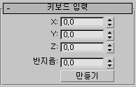 키보드 입력 롤아웃에는 X, Y, Z로 레이블이 지정된 일반적인 위치 필드 세트가 있습니다. 입력한 숫자는 활성 구성 평면(홈 그리드 또는 그리드 오브젝트)의 축을 따른 간격띄우기입니다. 더하기 및 빼기 값은 해당 축의 양수 및 음수 방향에 해당합니다. 기본값은 활성 그리드의 중심인 0,0,0입니다.