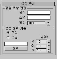 선택한 라디오 버튼에 따라 정점 색상 또는 조명 값이 색상 견본과 일치하거나 RGB 스피너에서 지정한 범위 안에 있는 모든 정점을 선택합니다.