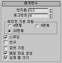 지표면은 표준 구보다 더 완곡한 표면을 생성합니다. 또한 동일한 수의 면이 지정된 표준 구보다 더 부드러운 프로파일을 사용하여 렌더링됩니다. 표준 구와 달리 지표면에는 극이 없어 FFD(자유형 변형) 수정자와 같은 특정 수정자를 적용할 경우 유용할 수 있습니다.