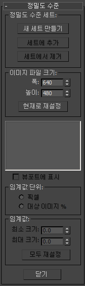이 영역에 있는 폭 및 높이 스피너는 정밀도 수준 유틸리티를 시작할 때마다 현재 렌더링 출력 크기로 설정됩니다. 이 스피너를 사용하여 임의의 해상도로 변경할 수 있습니다. 대상 이미지 % 옵션을 선택하면 대상 이미지 크기를 변경할 때 임계값도 변경됩니다.