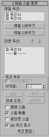 2 레일 스윕 하위 오브젝트가 선택되어 있는 동안 2 레일 스윕 매개변수가 있는 롤아웃이 나타납니다. 이 롤아웃은 하나의 2-레일 스윕 하위 오브젝트가 선택될 때에만 나타납니다. 한 번에 하나 이상의 2-레일 스윕을 편집하는 것은 불가능합니다. 그래서 다른 NURBS 하위 오브젝트와 달리 복수의 2-레일 스윕 하위 오브젝트가 선택되면 롤아웃은 나타나지 않습니다.