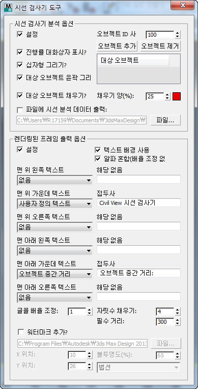 대화상자 컨트롤의 이 부분은 오브젝트의 렌더링된 프레임 및 거리 정보를 분석하는 프로세스를 제어합니다.